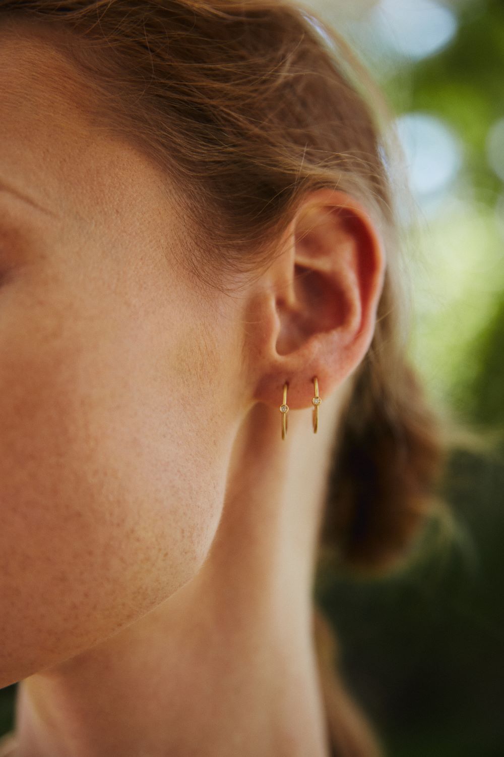 Argolas em ouro amarelo amarelo com acabamento fosco e 2 diamantes redondos brilhantes totalizando 2 pontos. Dimensões aproximadas: 1,5cm de diâmetro. Produto sob encomenda, prazo de entrega de até 40 dias.