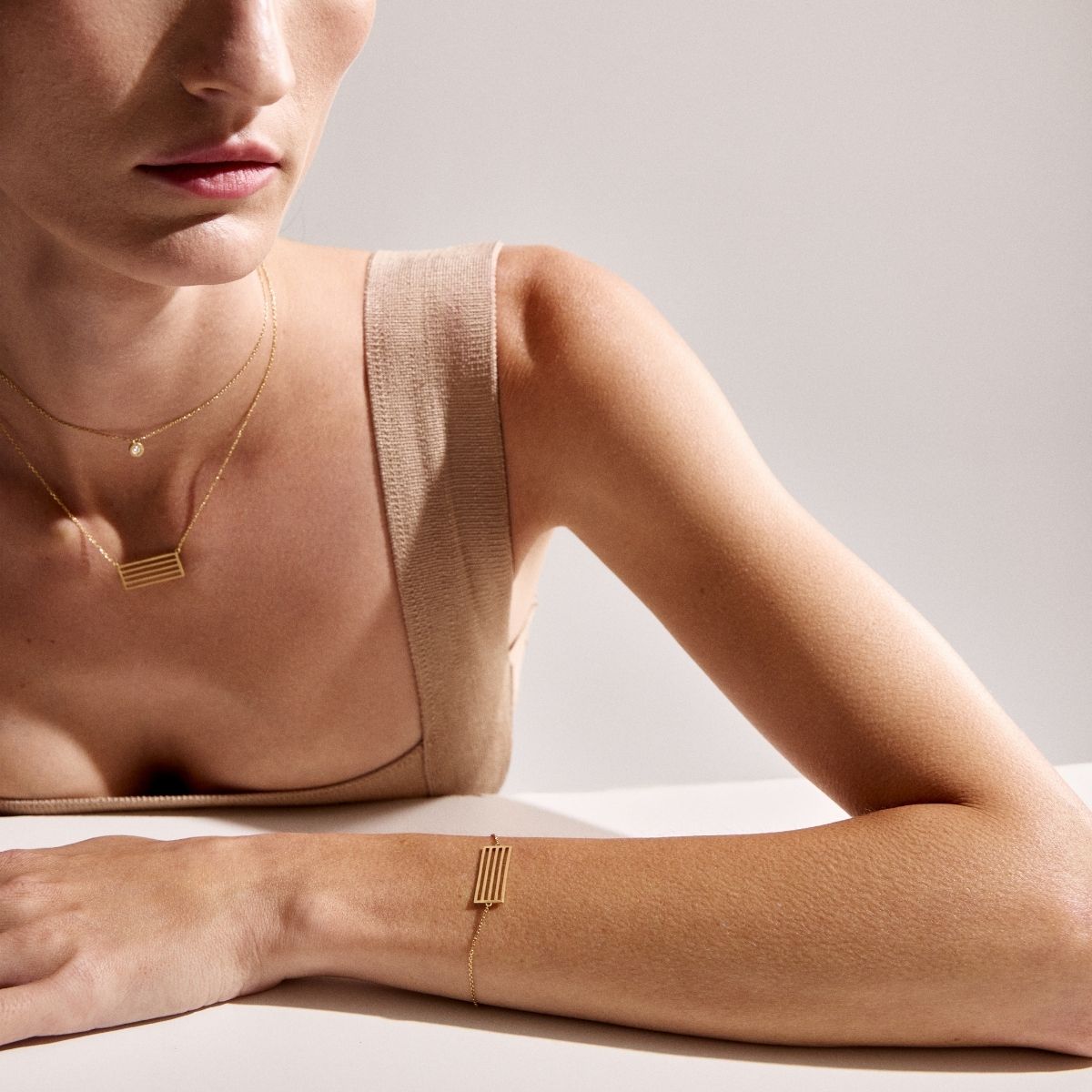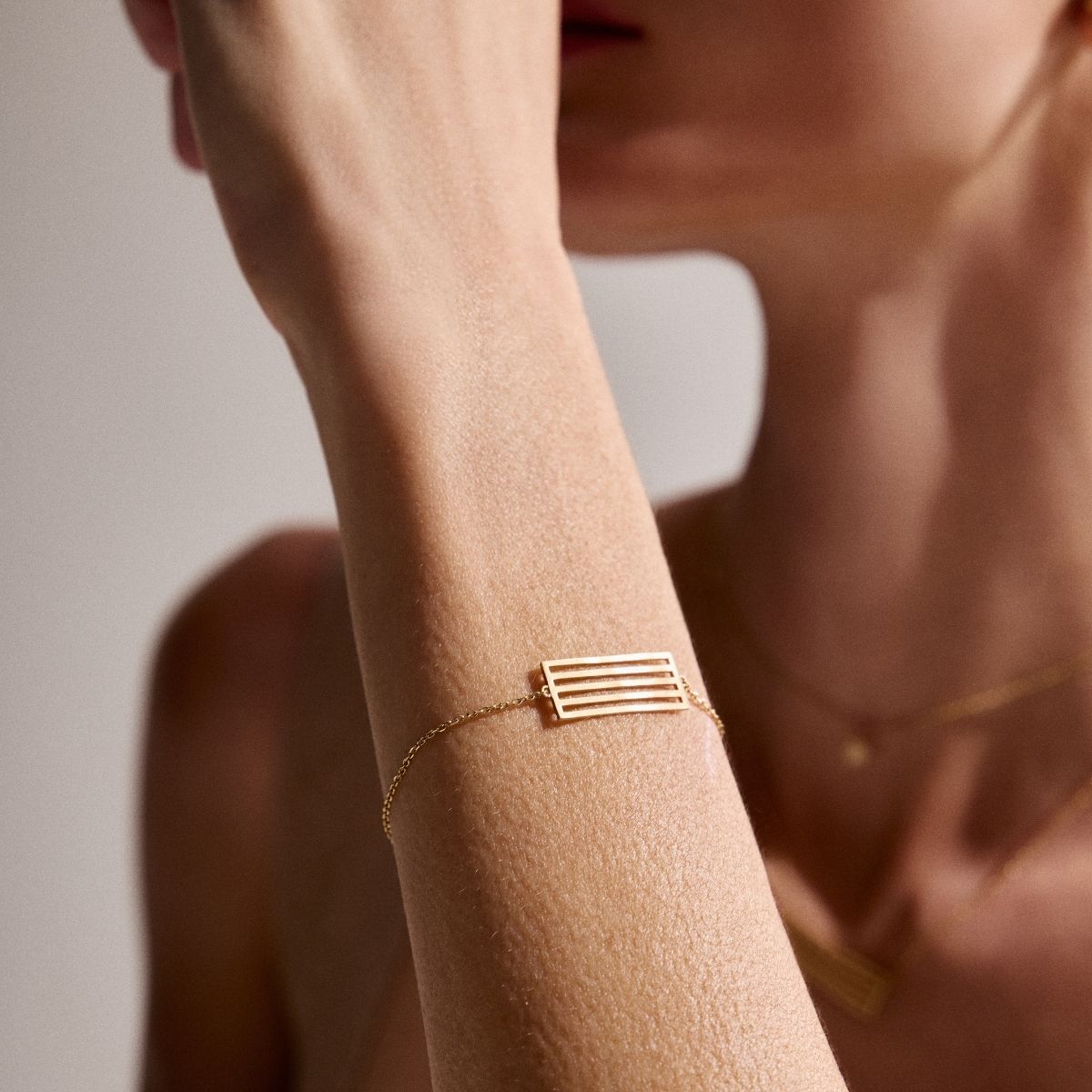 Pulseira com placa ripada em ouro amarelo com acabamento fosco. Dimensões aproximadas da placa: 2,4x1cm.