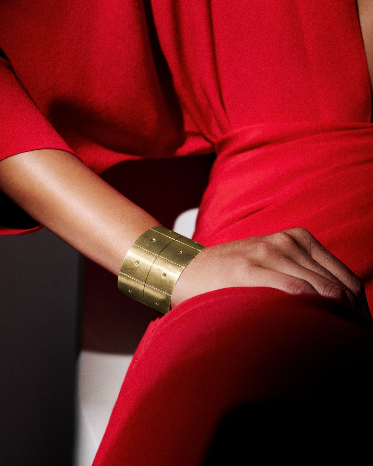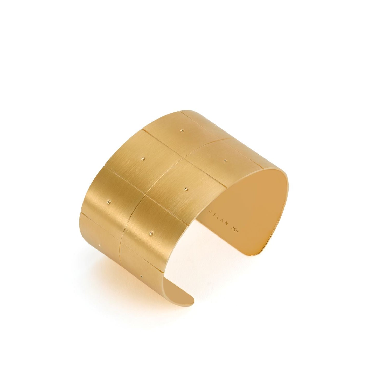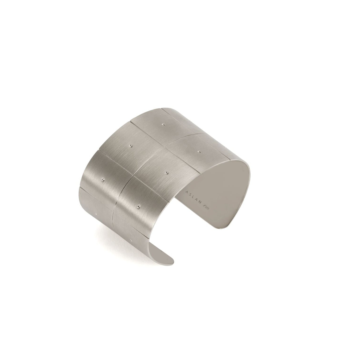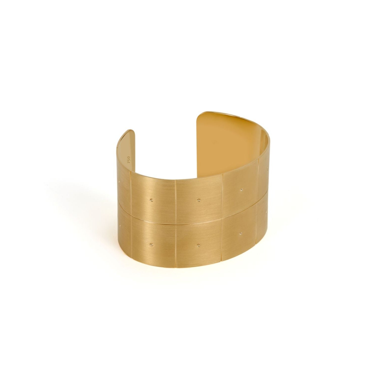Bracelete aberto com 4,3cm de largura e acabamento fosco por fora e e polido por dentro. Pode ser feito em ouro branco ou amarelo 18k.
