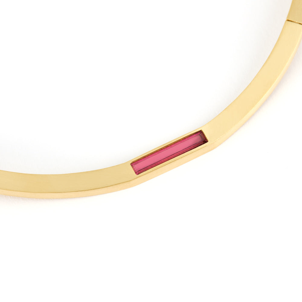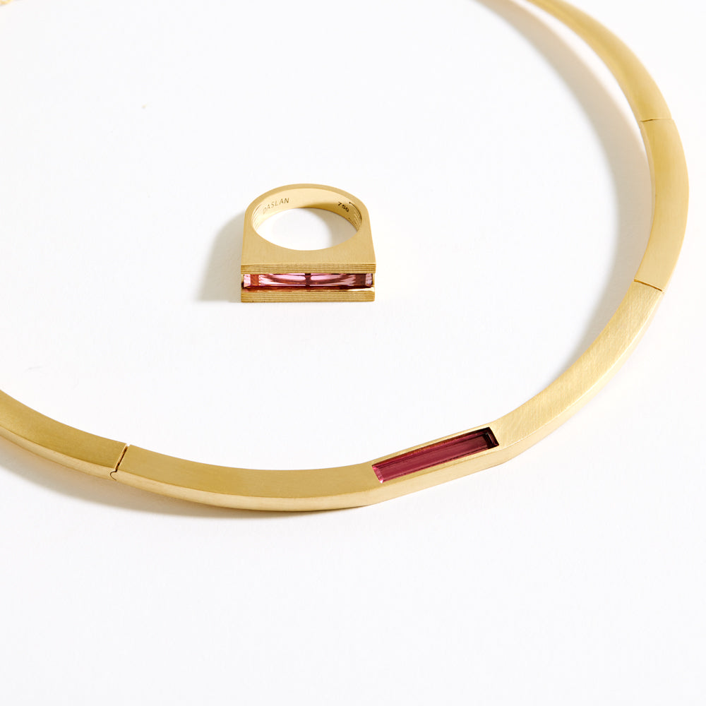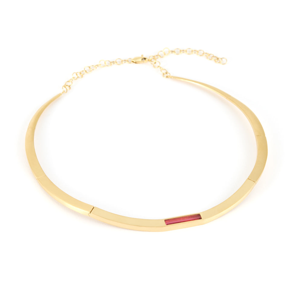 Colar RR em ouro amarelo 18k com acabamento fosco e rubelita, é uma peça anatômica e ligeiramente flexível e mede 38cm de comprimento.