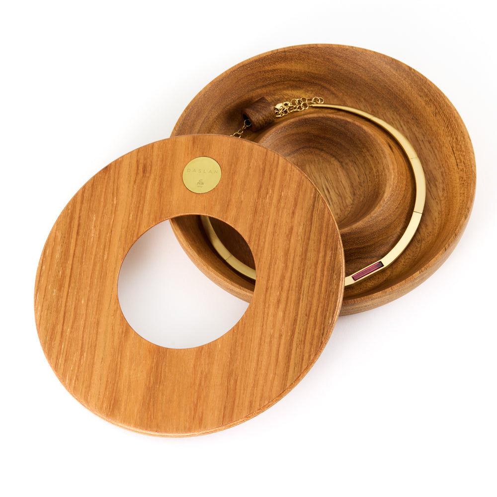 O Colar RR vem acompanhado de uma caixa de madeira desenvolvida especialmente pela designer Claudia Moreira Salles. O porta-colar, que pode se tornar um porta-joias ou item de decoração, valoriza a peça como objeto e amplia a experiência de quem recebe, ao unir design brasileiro e joalheria em uma mesma narrativa.